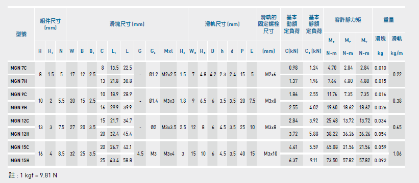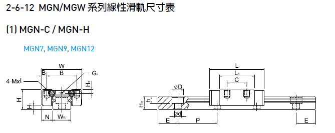 上银滑块MGN12H参数如下: